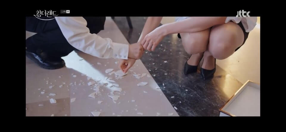 구원의 혼담이 오가자 당황한 사랑이는 그릇을 깨고맙니다. 수습하려는 찰나 손 다칠까봐 낚아채는 구원본부장. "괜찮냐고 묻잖아" 대사에 심장 녹아듭니다. 그순간 구원의 약혼녀가 눈치챈 모양입니다 표정이 싹 굳어요. 사랑이 찾아가서 해코지할까봐 겁납니다..